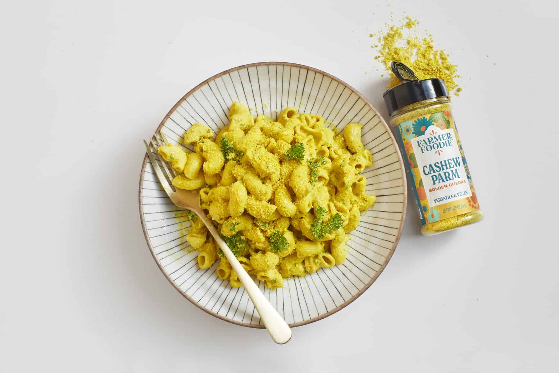 Farmer Foodie's cashew parm is perfect for sprinkling. It has simple, plant-based ingredients like cashews, herbs, and nutritional yeast. Try Golden Chedda or Italian Herb Cashew Parmâ„¢ on your favorite pasta, salads, or even popcorn – my favorite snack! It creates a cheesy, delicious snack that satisfies the need for an umami flavor without the need for cheese.