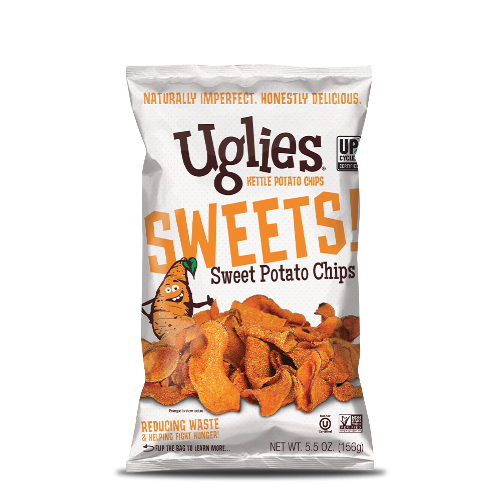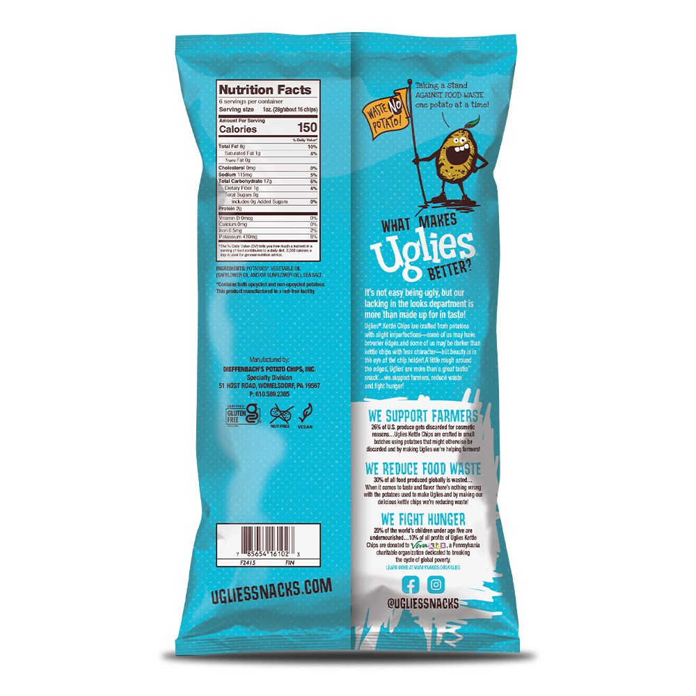 Uglies® Kettle Chips are Upcycled Certified™ and crafted from potatoes with minor cosmetic imperfections… This includes potatoes that are too large or small; those with varying colors or have the wrong sugar content. Some might be slightly blemished and, of course, some are just farmer surplus, but beauty is in the eye of the chip-holder! Until now, these orphaned potatoes were destined to become food waste, but we use them to create perfectly delicious small batch kettle chips! By purchasing Uglies® Kettle Chips, you are helping support farmers and reduce food waste! Even better, 10% of all profits from Uglies Kettle Chips are donated to VivaKids to help fight childhood hunger! Uglies come in 7 delicious flavors, like Sea Salt, Bar-B-Que, Salt & Vinegar, Buffalo Ranch, Jalapeno, Cheddar & Sour Cream, or our hugely-popular Sweet Potato Kettle Chips!