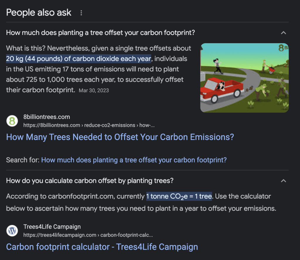 For example, a popular method of carbon offsets includes planting trees. However, but a tree may take over 50 years for to reach its carbon sequestering potential. And along that time, there is limited consensus on how much carbon a single tree can capture. For example, in a quick Google search for carbon offsets with trees, I found that one credit can equal anywhere from one tree to twenty trees!