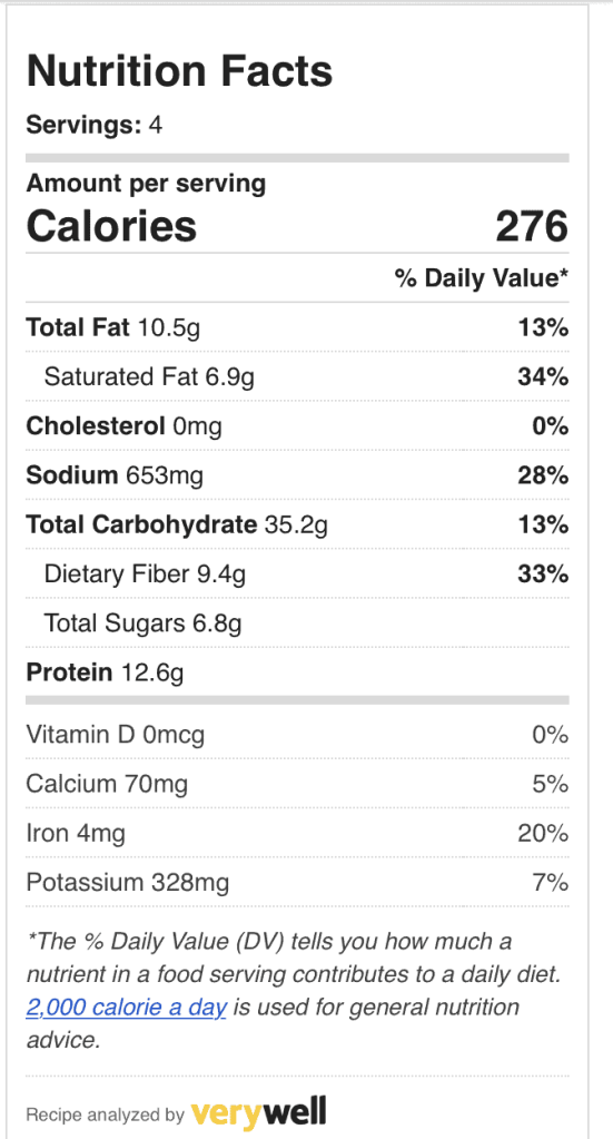 The soup makes about four servings, each just under 300 calories, 13 g protein, and 10 g fiber. It has about 20% of the recommended daily amount of iron, which is great for people on a plant-based diet. The low calories make it a great option to serve with bread, as an appetizer or a side dish, or simply if you're looking to cut back on calories for weight loss. The higher protein and fiber in the soup will leave you feeling full.